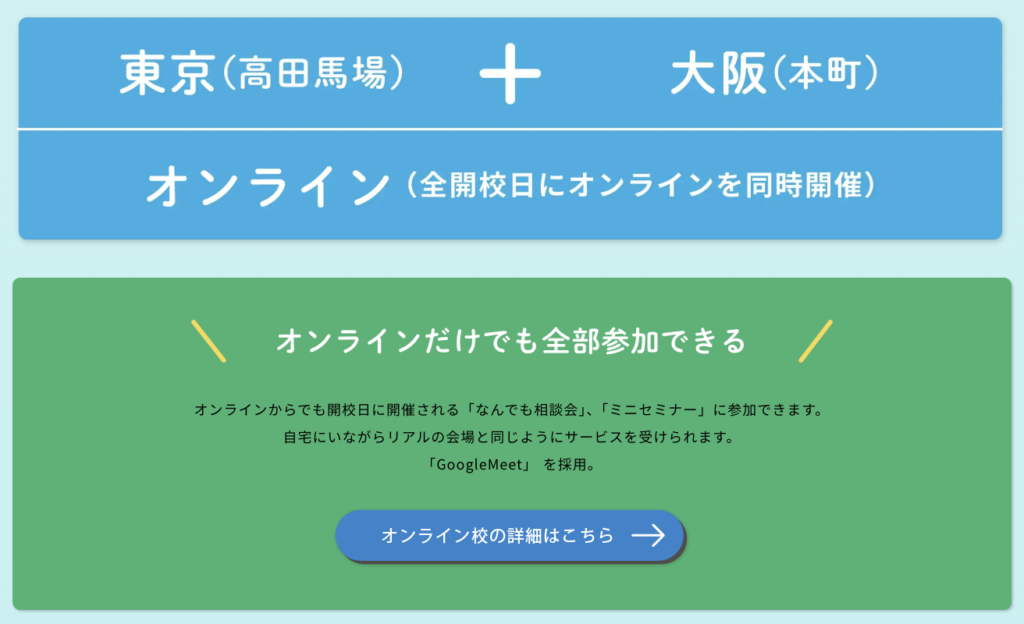 | 場所 | リアル(東京・大阪) オンライン(地方・海外OK) |